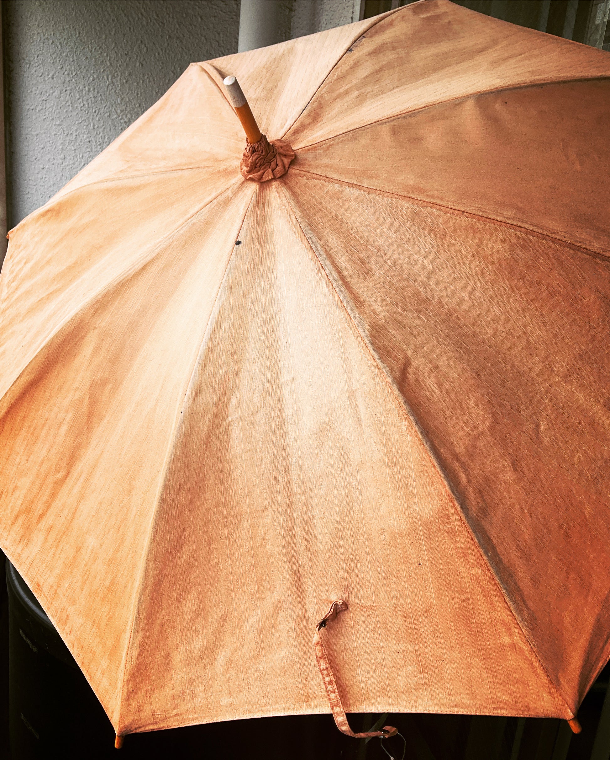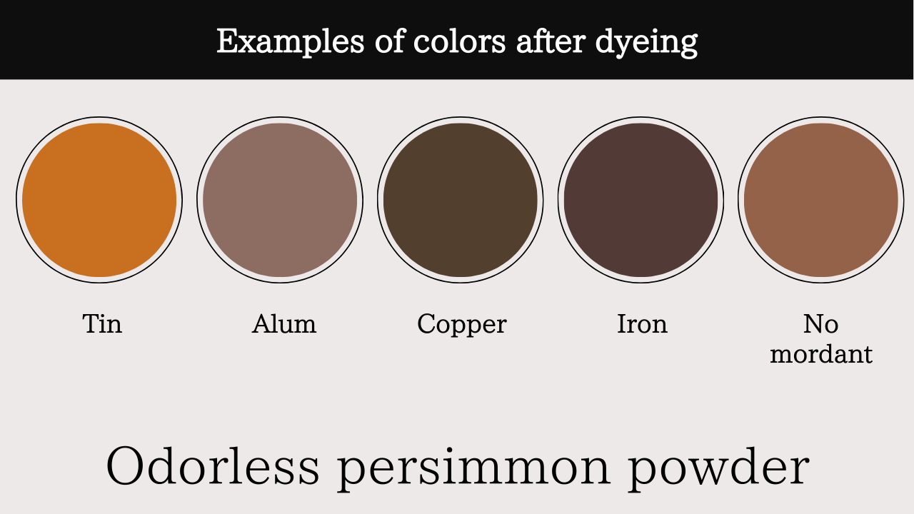 This is persimmon powder and dye fabric with orange-brown. Kakishibu has been used as a Japanese dye for over 800 years when it came from China. Because of its antiseptic and waterproofing properties, it is also used to coat Shibugami, or Japanese traditional stencil paper. Its main ingredient is tannin.